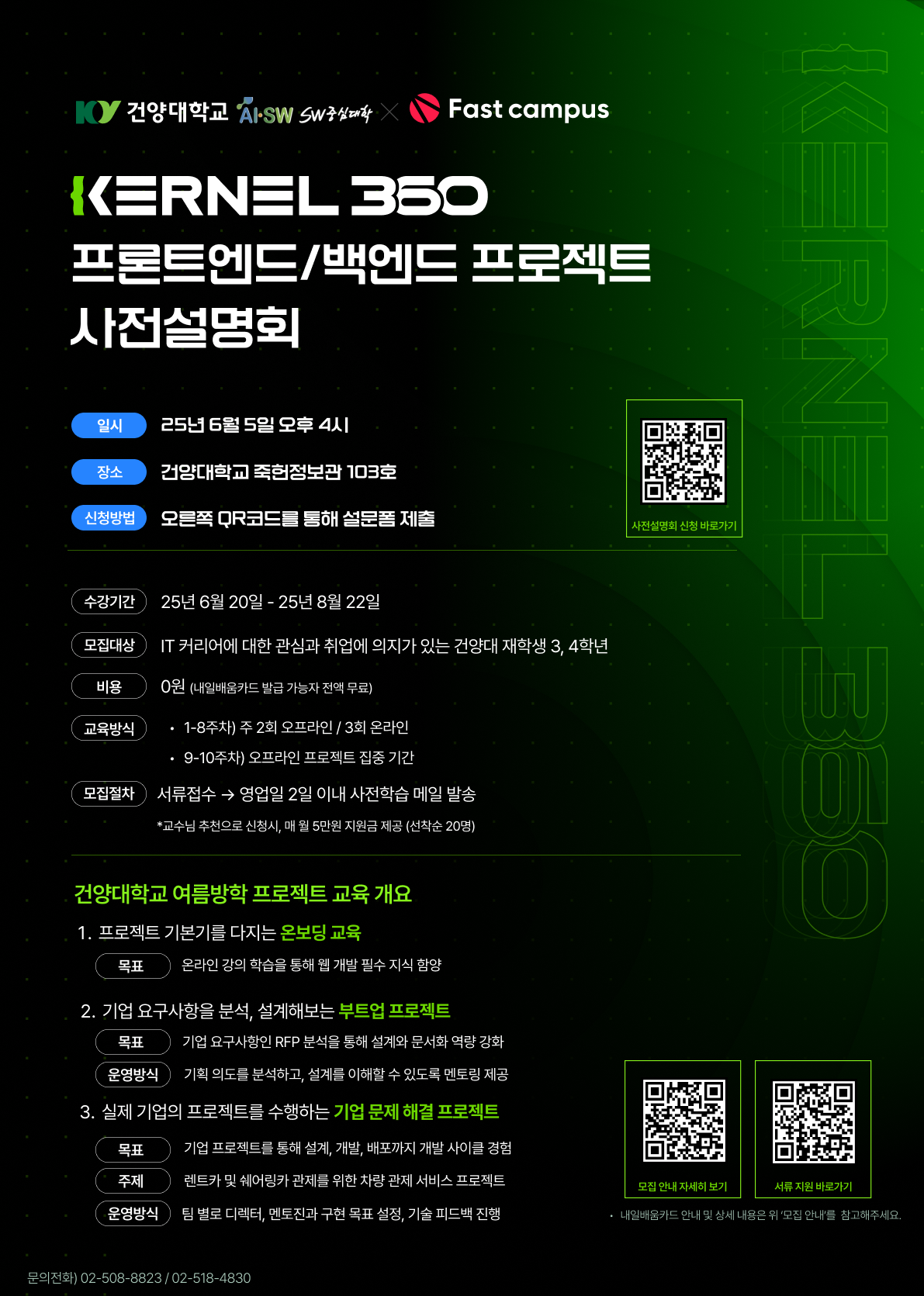 『 KERNEL 360 프론트엔드/백엔드 프로젝트 사전설명회 안내 』글의 상세내용을 확인하는 표로 제목, 부서명, 등록일, 조회, 첨부, 내용으로 나뉘어 설명합니다.