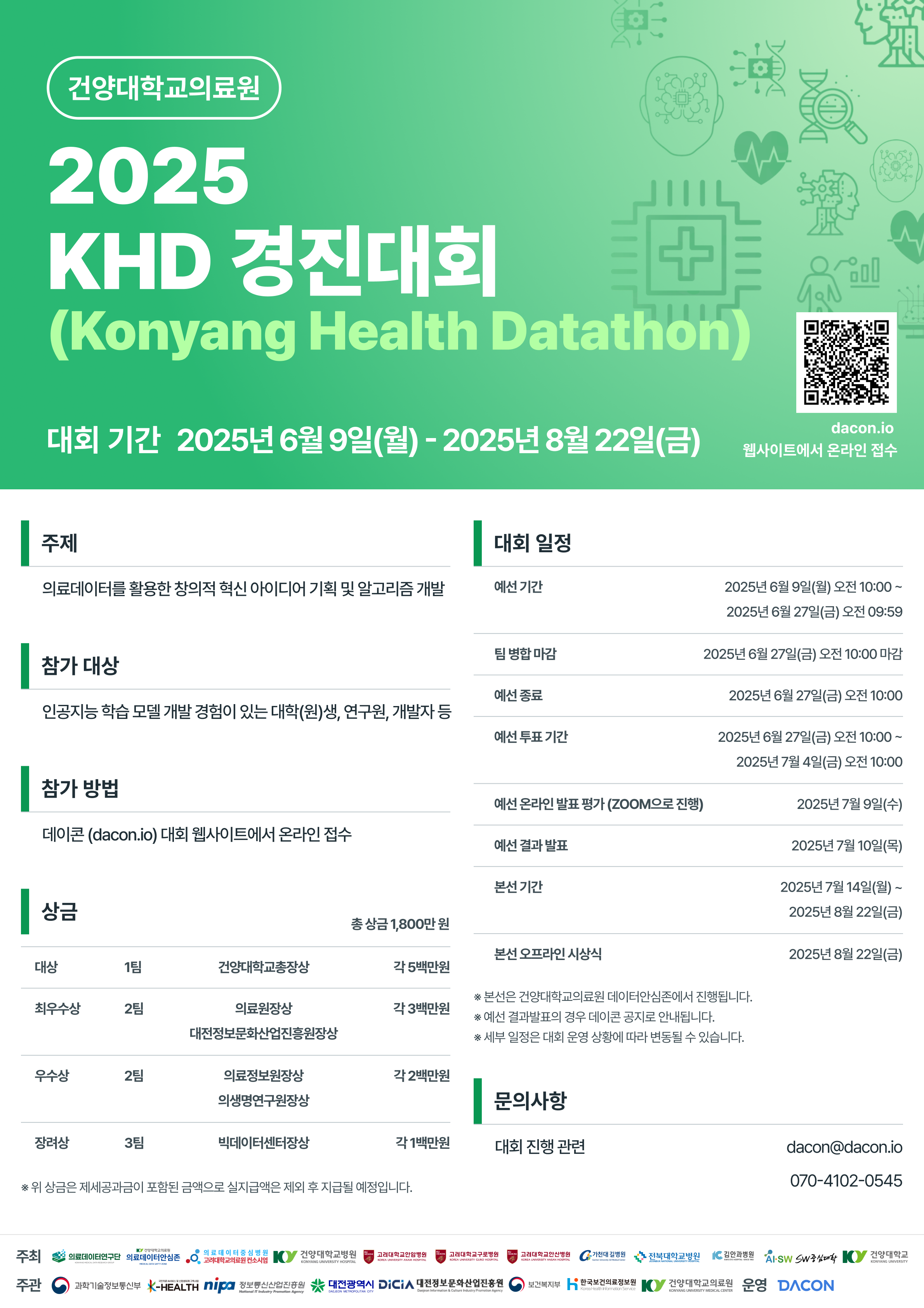 『 2025 KHD(Konyang Health Datathon) 경진대회 안내 』글의 상세내용을 확인하는 표로 제목, 부서명, 등록일, 조회, 첨부, 내용으로 나뉘어 설명합니다.