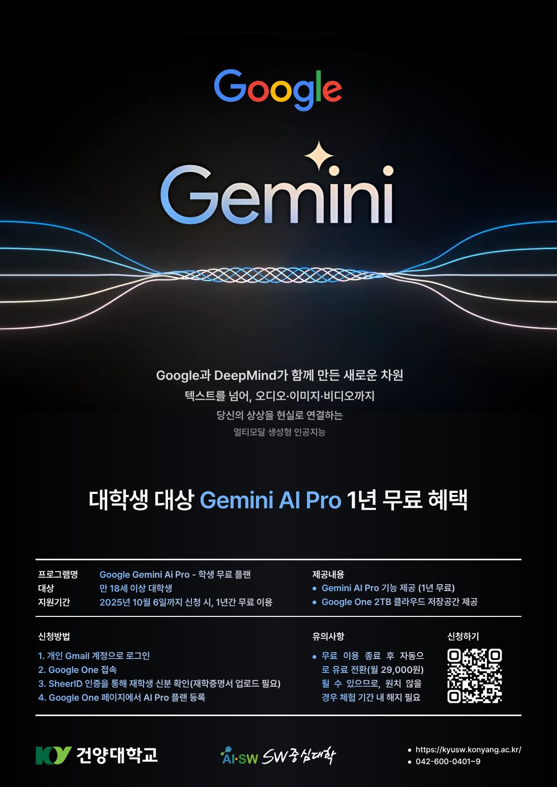 1. 프로그램 개요 - 프로그램명: Google Gemini AI Pro - 학생 무료 플랜 - 대상: 만 18세 이상 대학생 - 지원 기간: 2025년 10월 6일까지 신청 시, 1년간 무료 이용 - 신청 및 상세 내용: https://gemini.google/students/